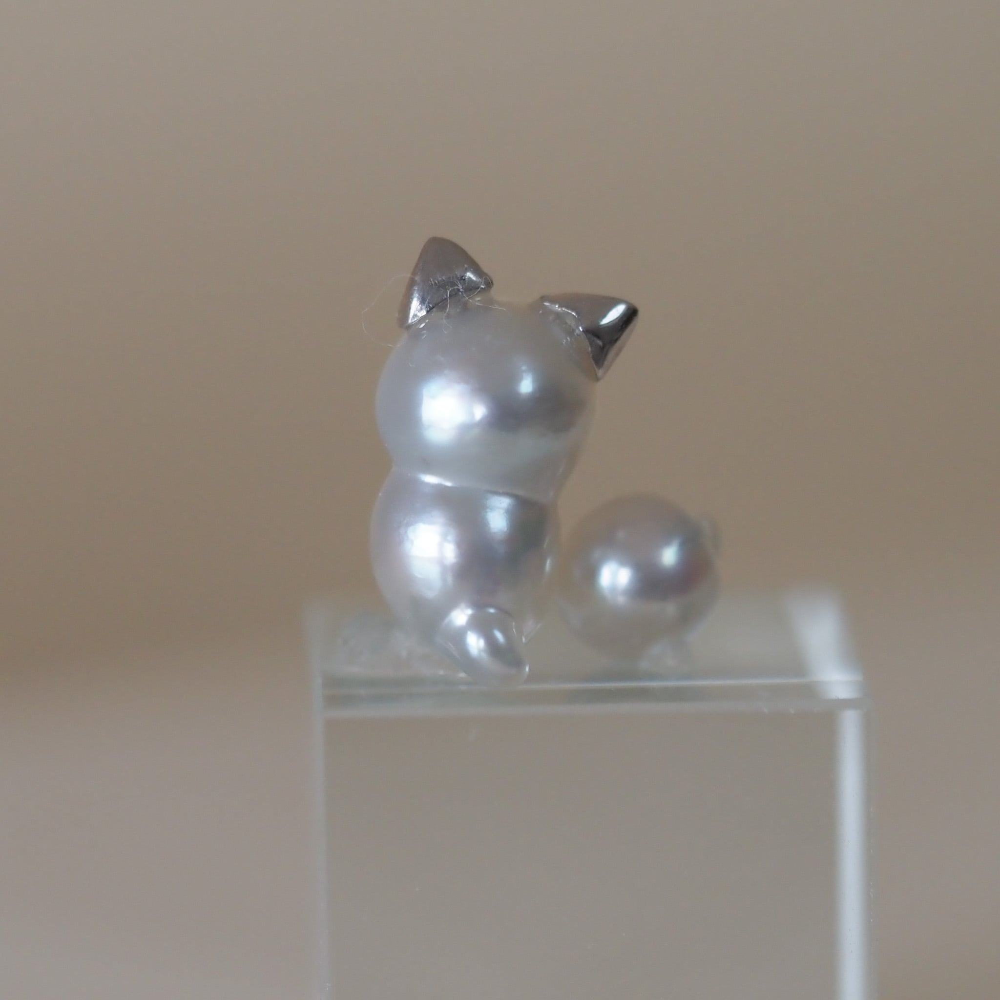 あこや貝が生み出した奇跡の形。 偶然くっつき合った双子の真珠(ツインパール)に、「しっぽ」がはえたような、極めて希少なバロックパールを使用しています。このユニークな真珠に、可愛い猫耳を付けて「ねこ真珠」として生まれ変わらせました。