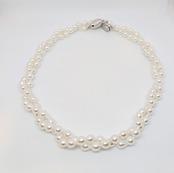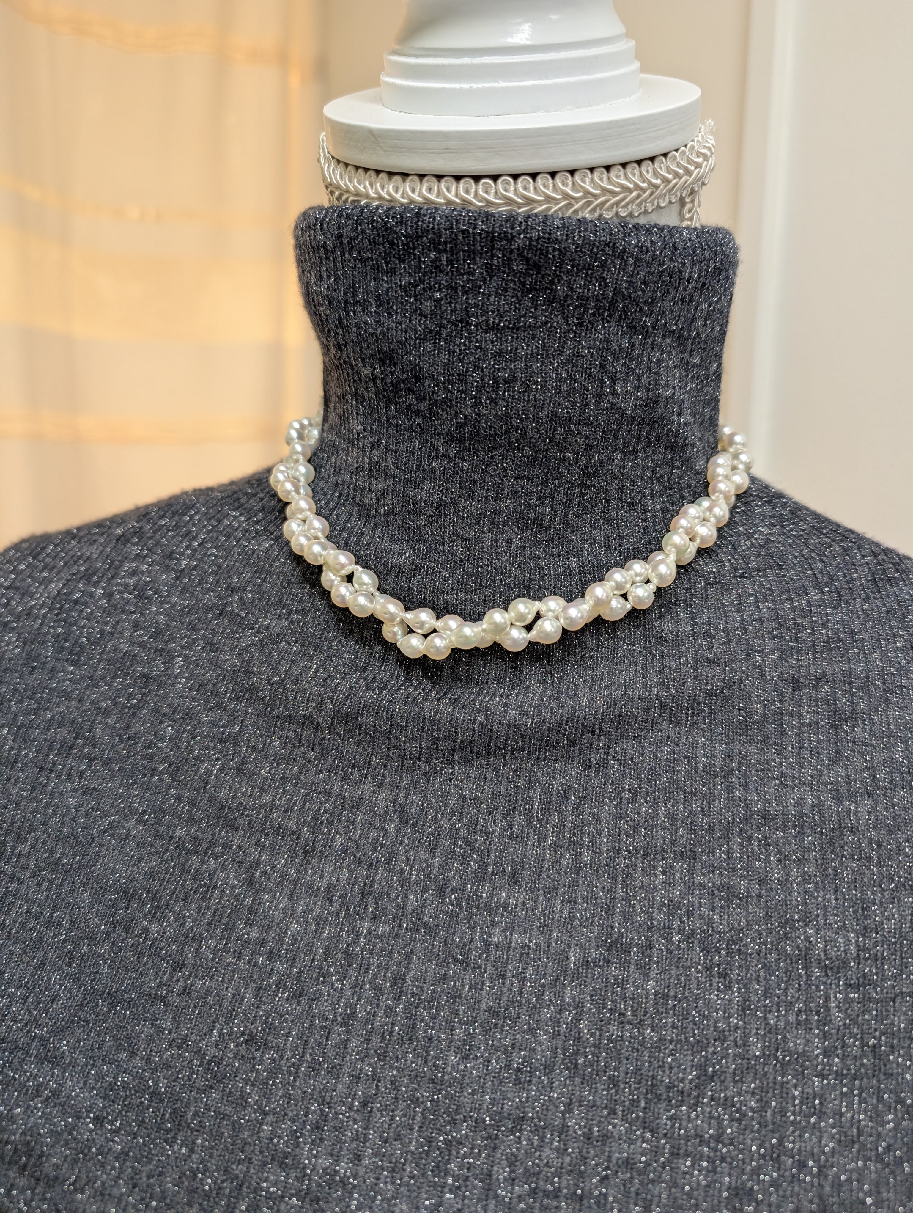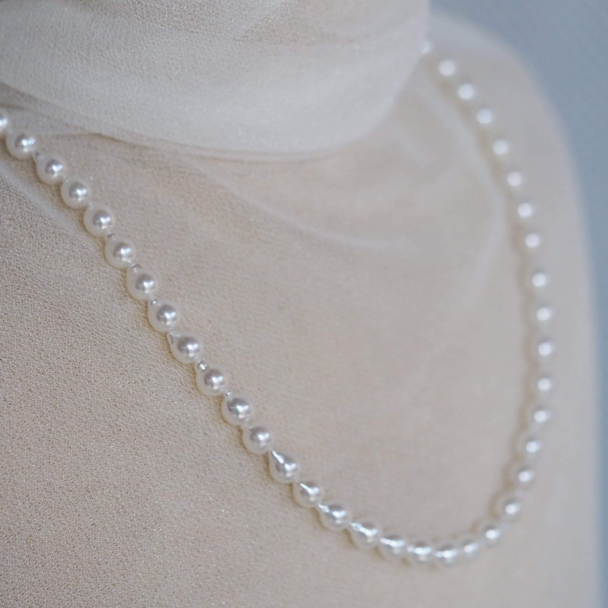 あこや真珠ならではの強いテリ(光沢)が美しい、40cmのネックレスです。 バロックパール(変形した真珠)を連ねることで、光が複雑に反射し、動くたびにキラキラと表情豊かに輝きます。